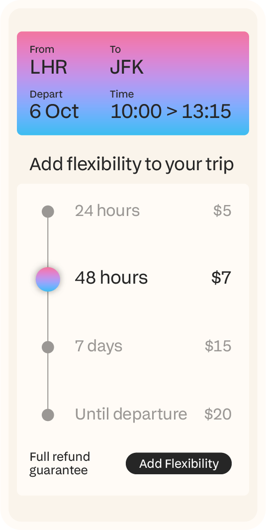 Offer travelers more affordable long-term flexibility from 14 days post-booking right up until departure, at a fraction of the cost of traditional CFAR, and with 100% refunds guaranteed.